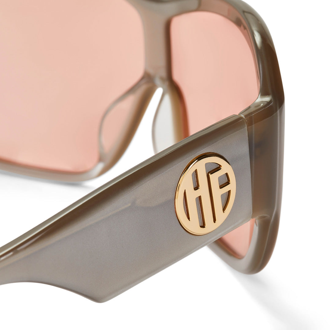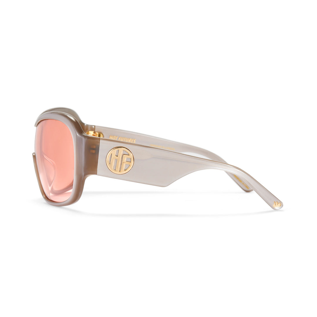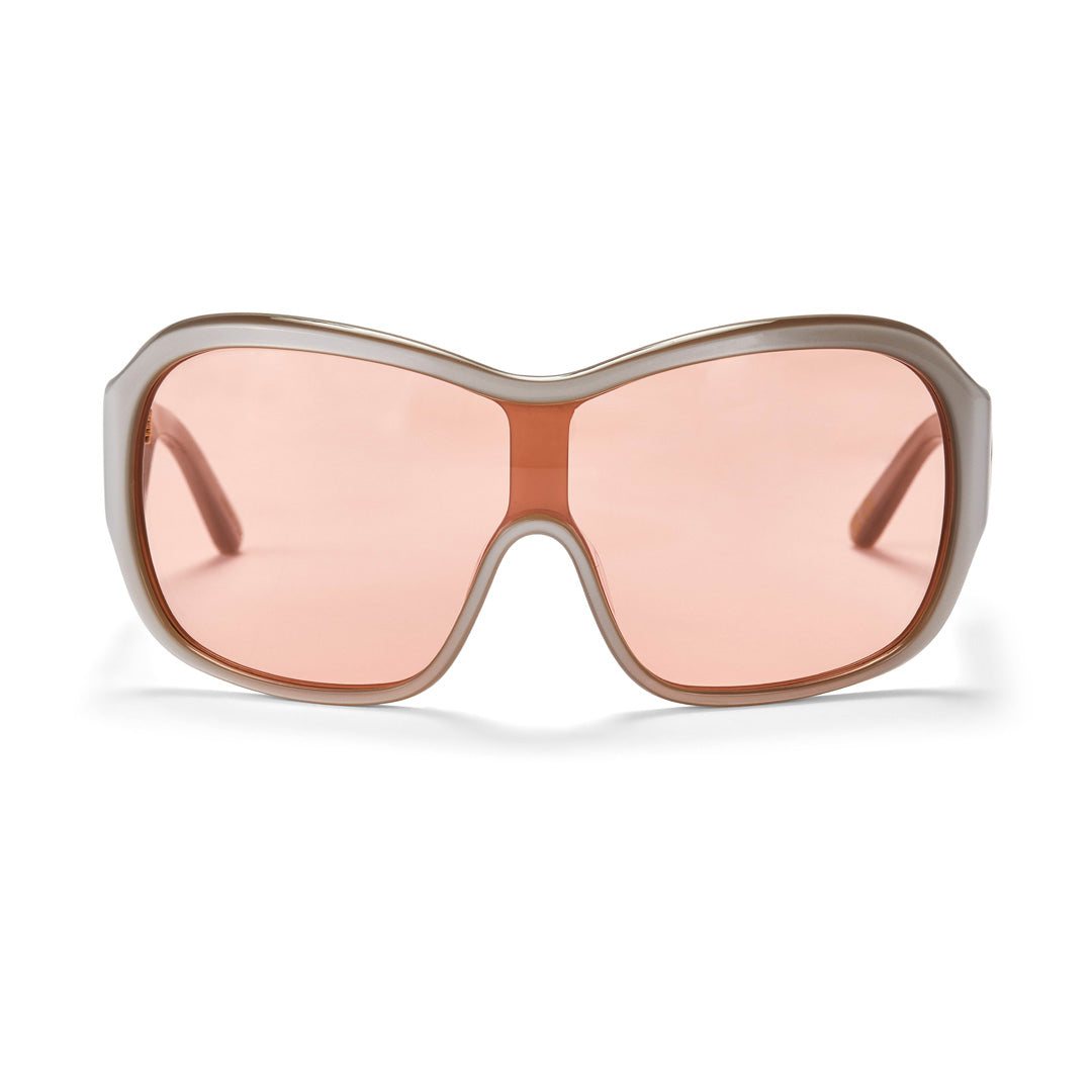 Silver acetate frame. Pink tinted 100% UVA/UVB protected CR39 Category 1 lenses. Three barrel alloy hinges. Three barrel alloy hinges. Frame width (edge to edge): 60mm // Temple Length: 55mm // Lens width: 27mm // Lens height: 21mm.