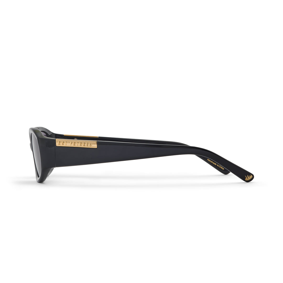 Slim oval racer with wrapped front to temple dimension and curved liquid edges. Completed with top side clip Hot Futures logo block and signature gold foil frame detailing.
