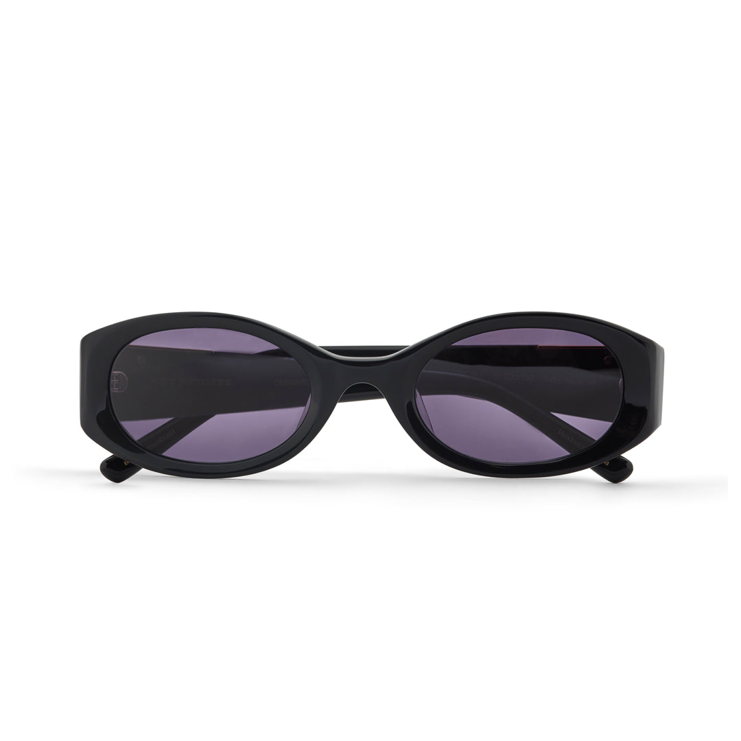 Recycled gloss black acetate frame (Global Recycled Standard). Smoke tinted 100% UVA/UVB protected CR39 Category 3 lenses. Three barrel alloy hinges. Frame width (edge to edge): 142mm // Temple Length: 135mm // Lens. width: 49mm // Lens height: 31mm.