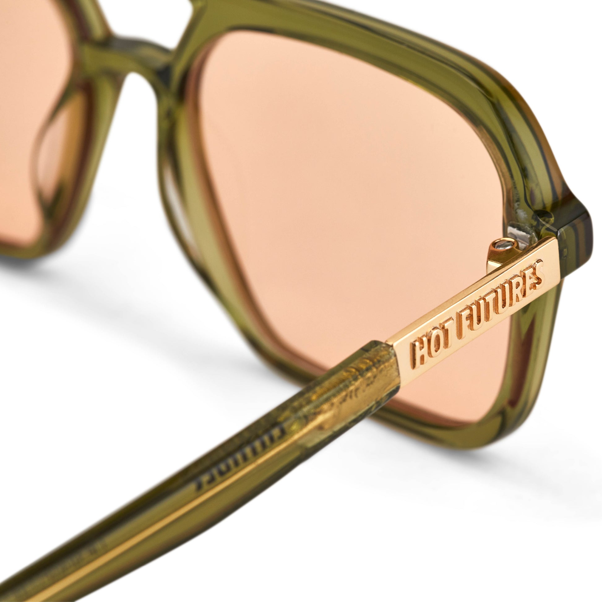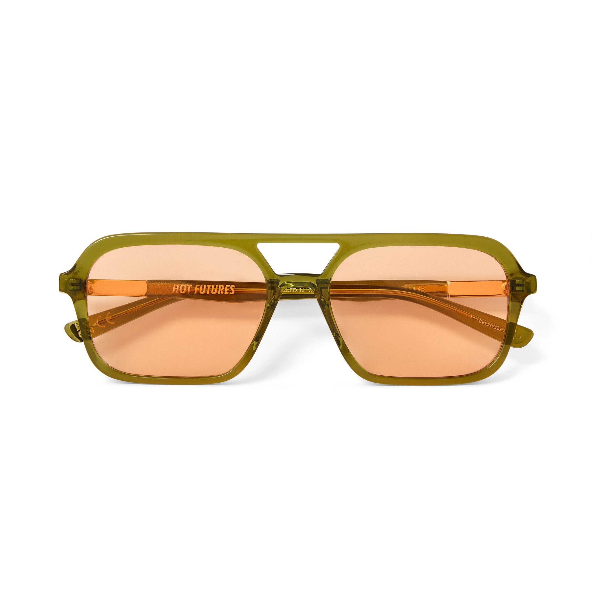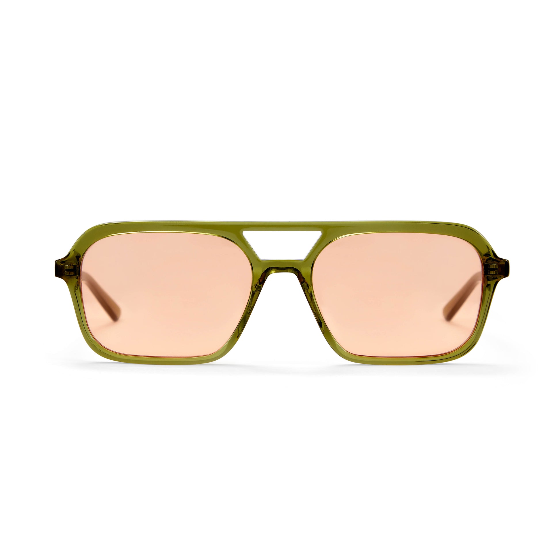 Clear crystal green plant based, recyclable and biodegradable bio-acetate frame. Amber tinted 100% UVA/UVB protected CR39 Category 1 lenses. Three barrel alloy hinges. Frame width (edge to edge): 143mm // Temple Length: 140mm // Lens width: 53.5mm // Lens height: 39mm.