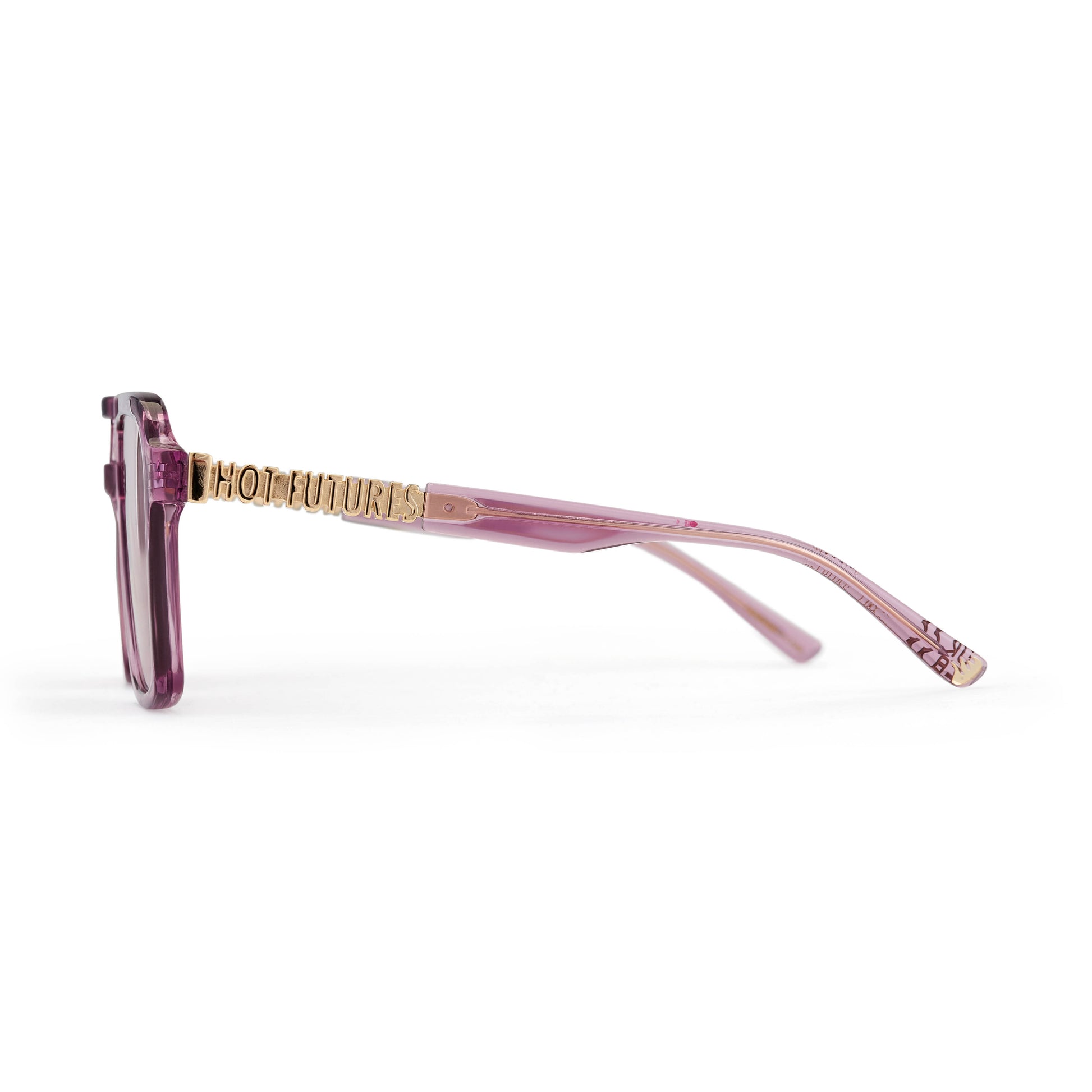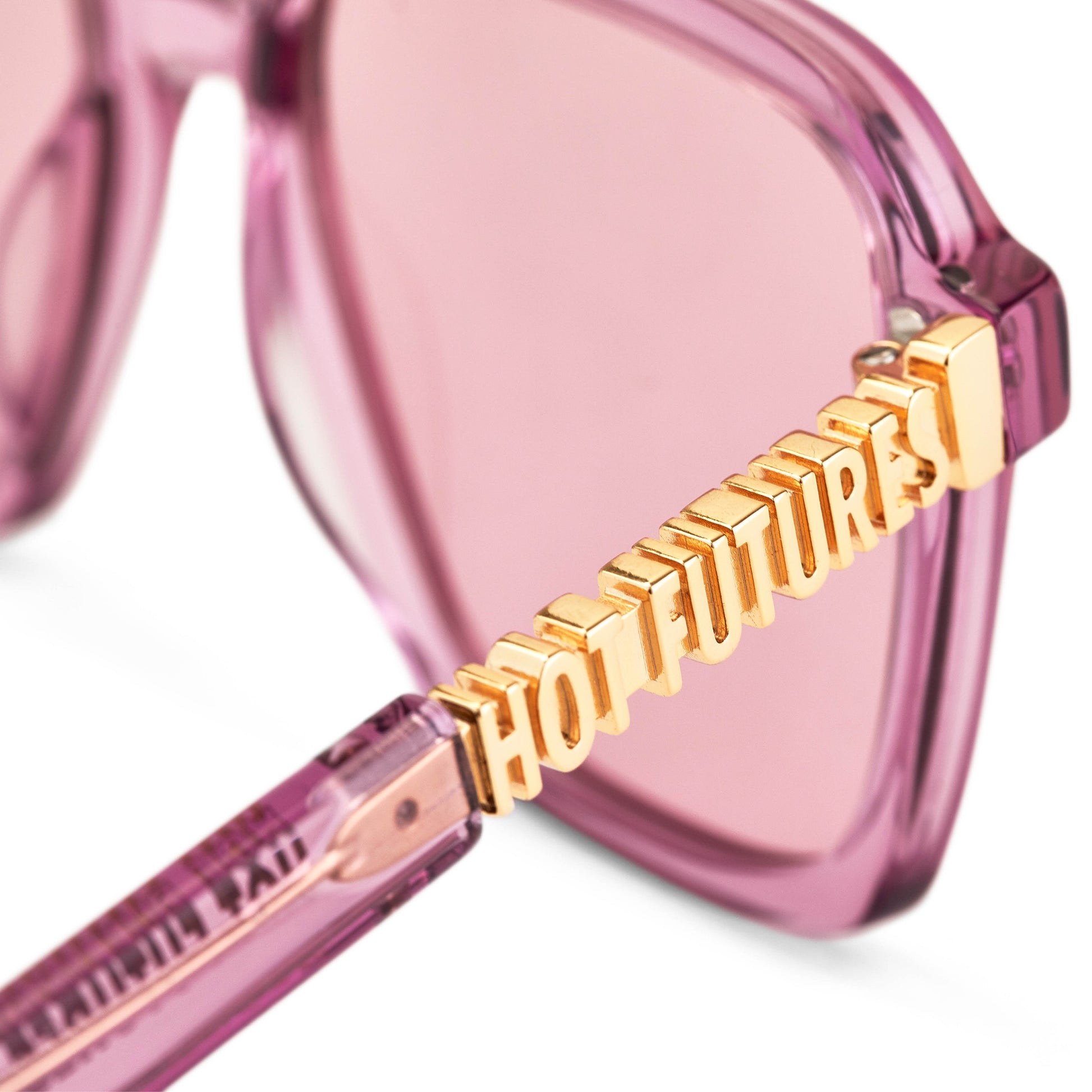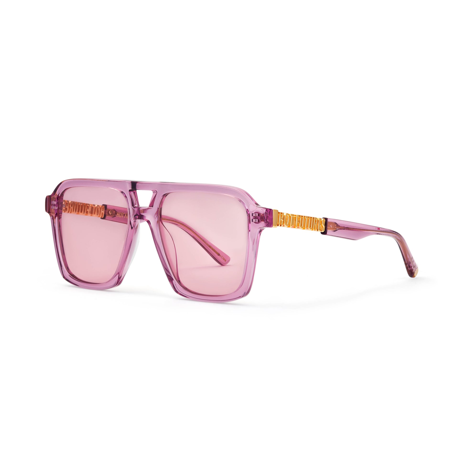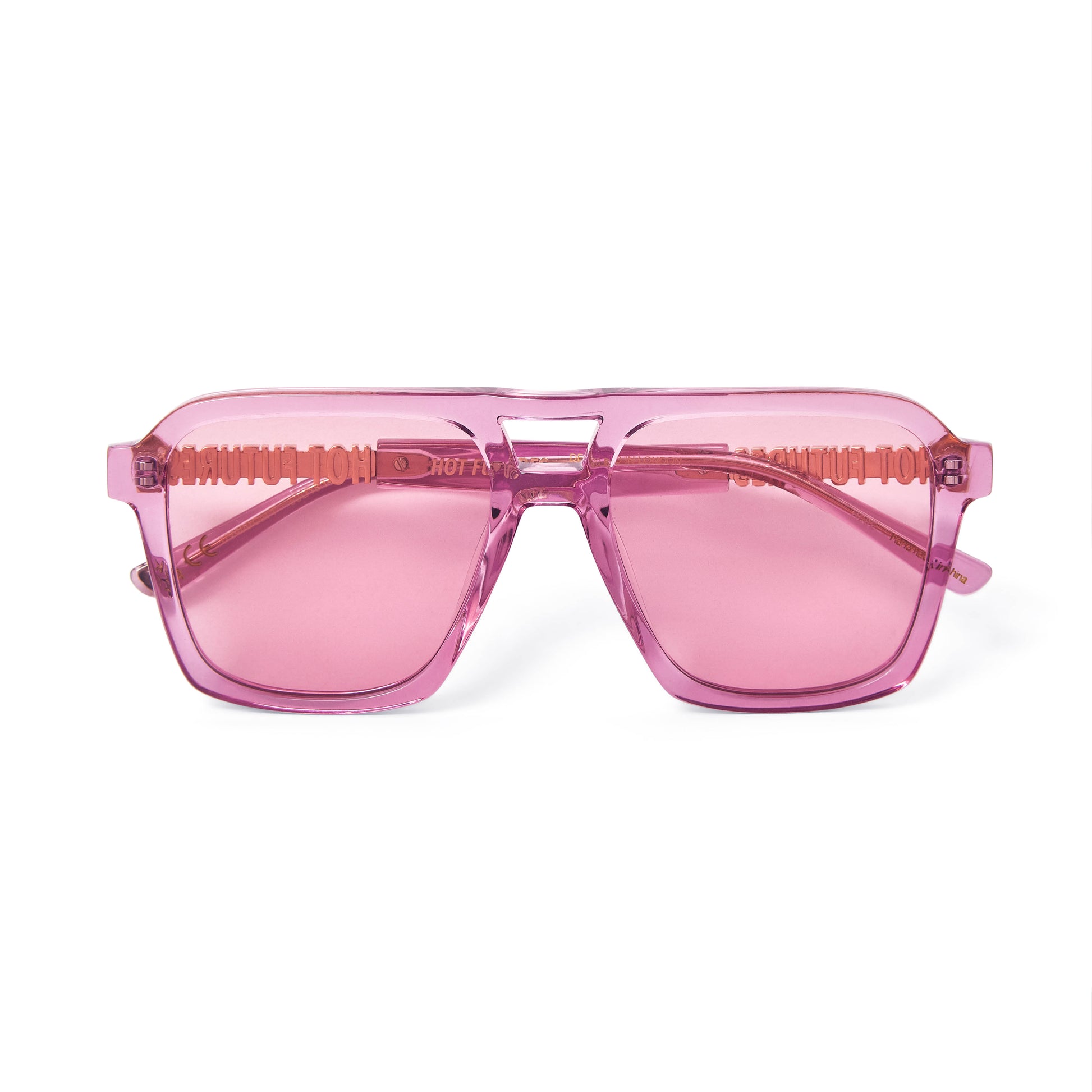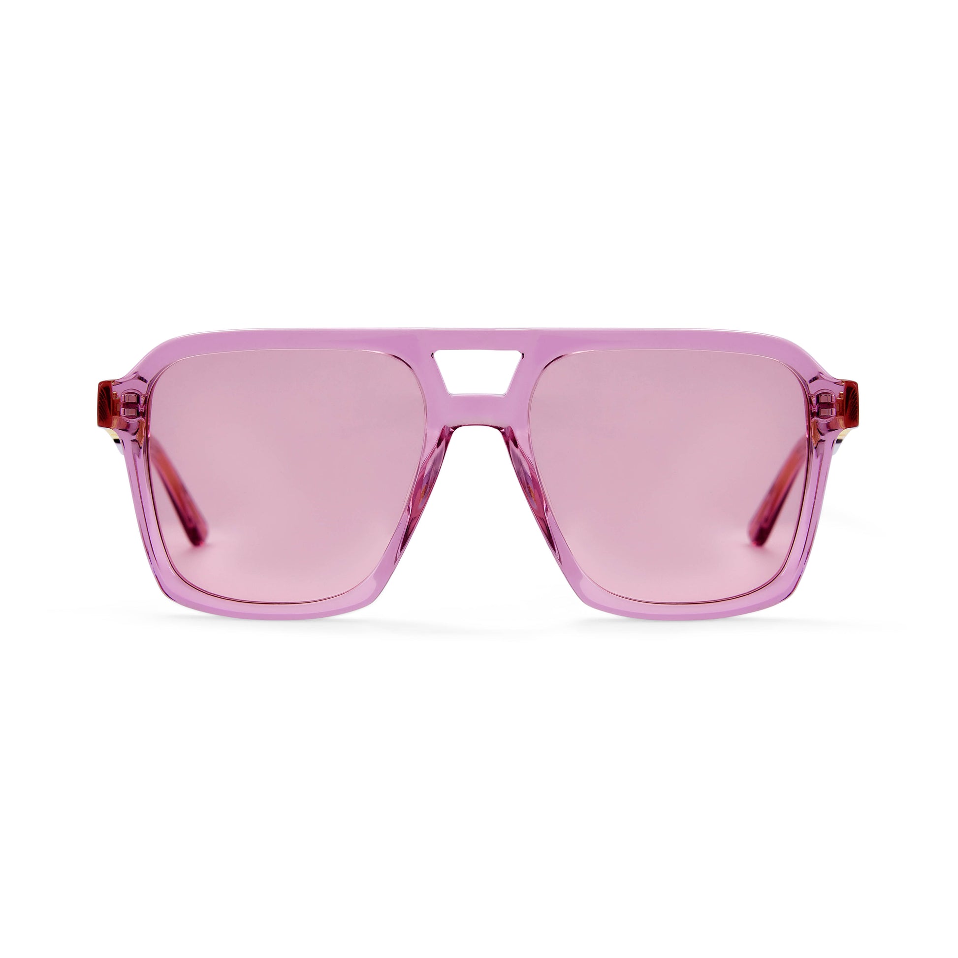 Eco clear pink plant based, recyclable and biodegradable bio-acetate acetate. Pink 100% UVA/UVB protected CR39 Category 1 lenses. Three barrel alloy hinges. Frame width (edge to edge): 140mm // Temple Length: 140mm // Lens width: 51mm // Lens height: 47mm.