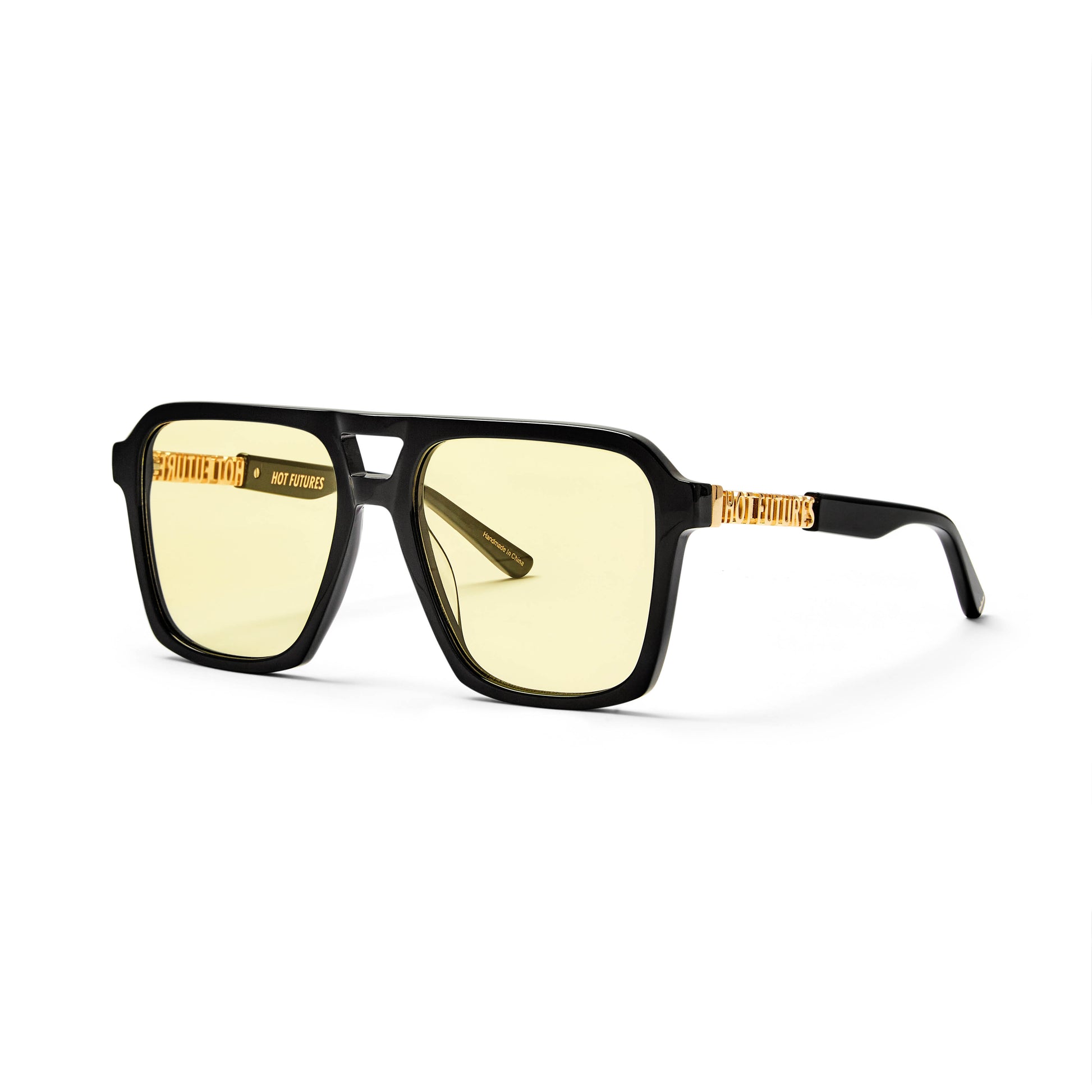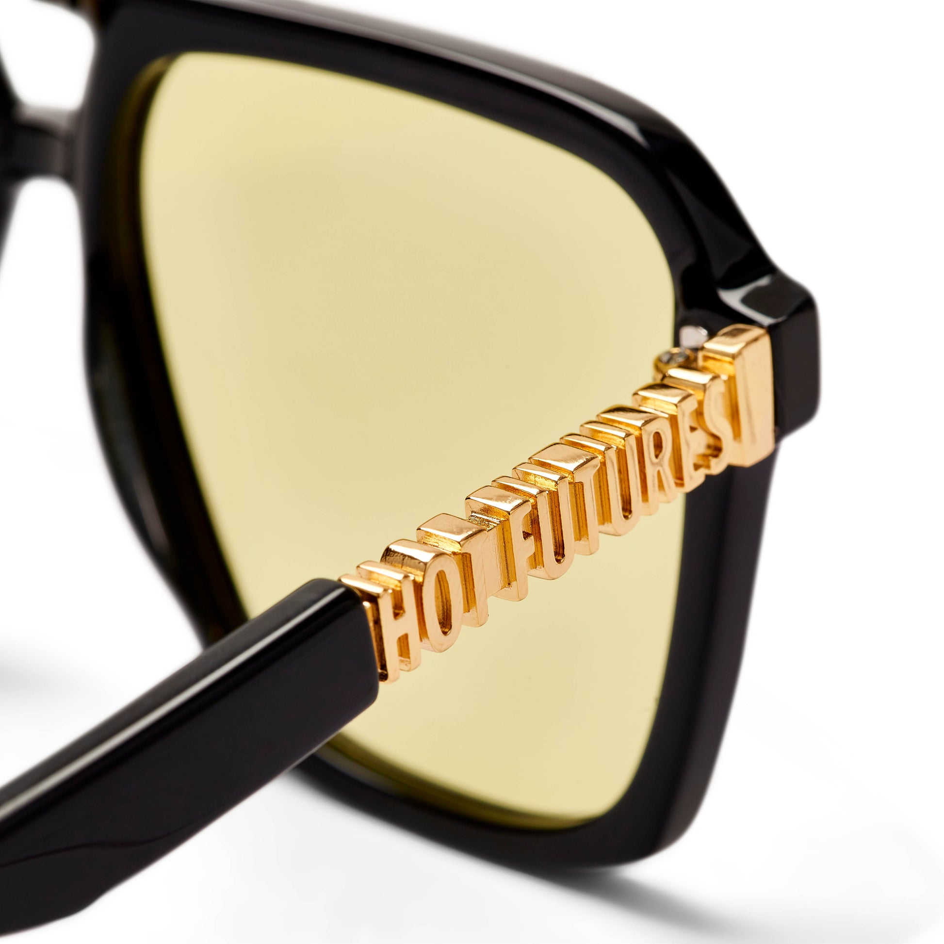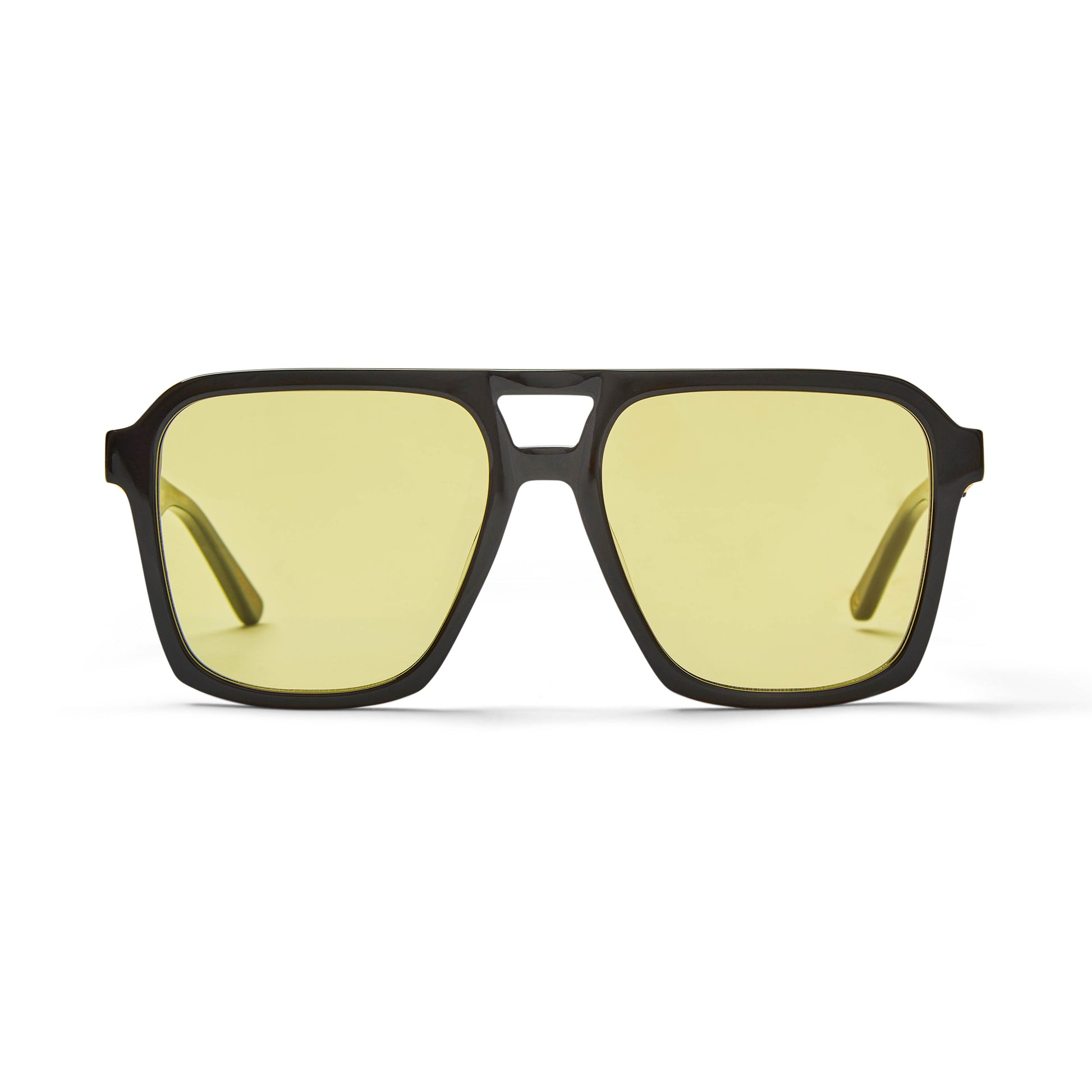 Gloss black recycled acetate (Global Recycled Standard). Yellow tinted 100% UVA/UVB protected CR39 Category 1 lenses. Three barrel alloy hinges. Frame width (edge to edge): 140mm // Temple Length: 140mm // Lens width: 51mm // Lens height: 47mm.