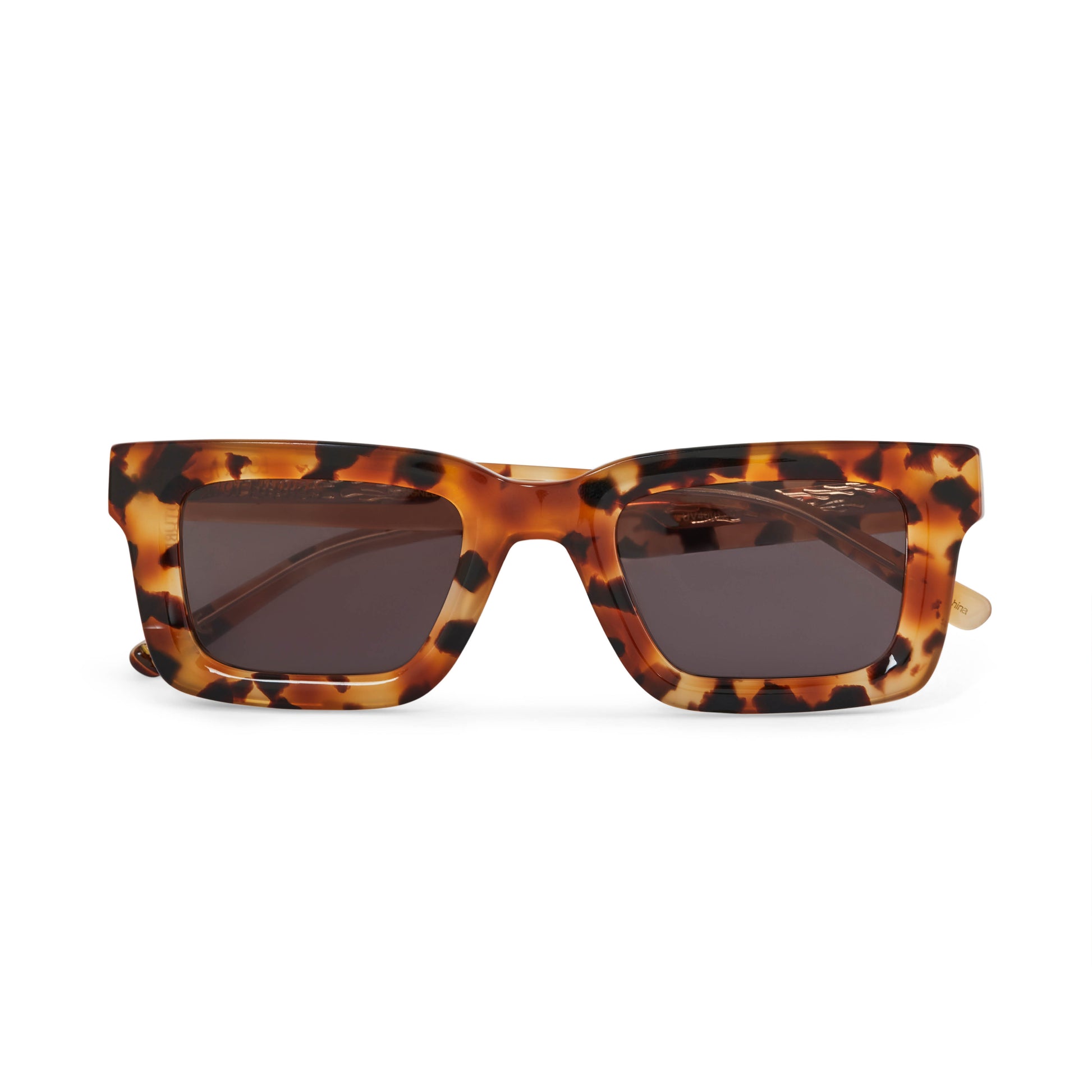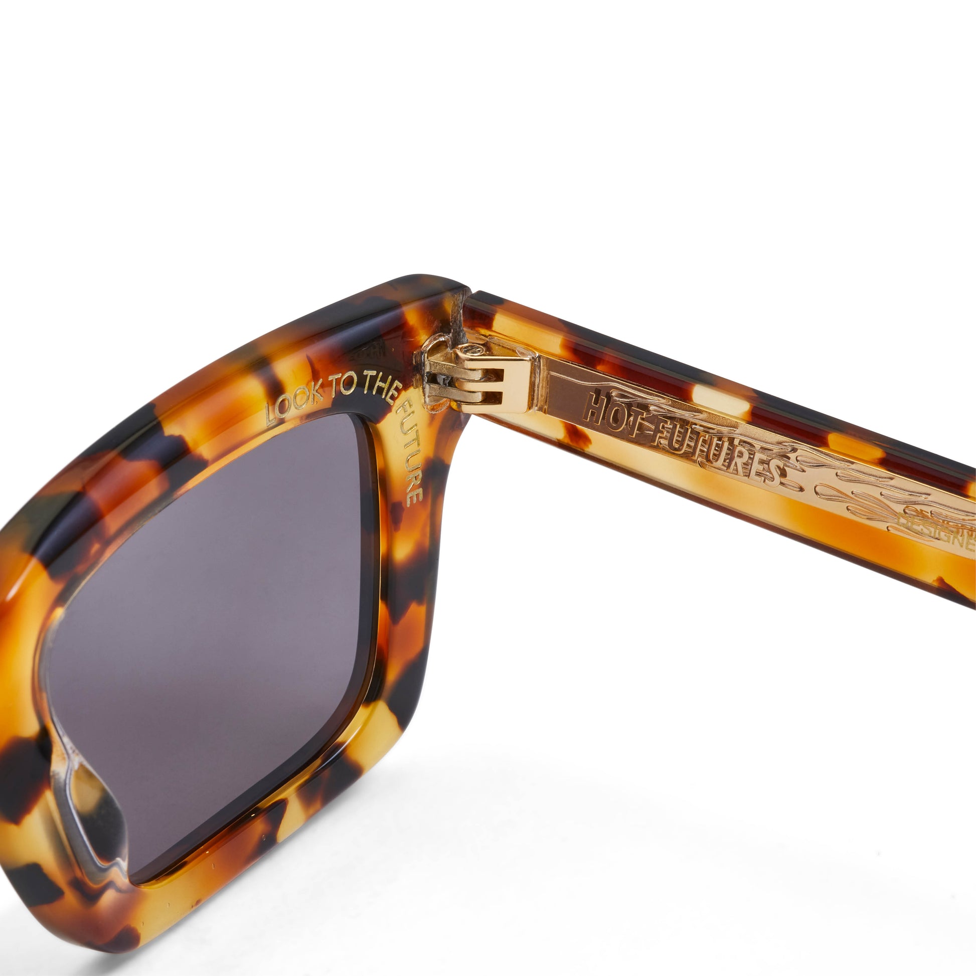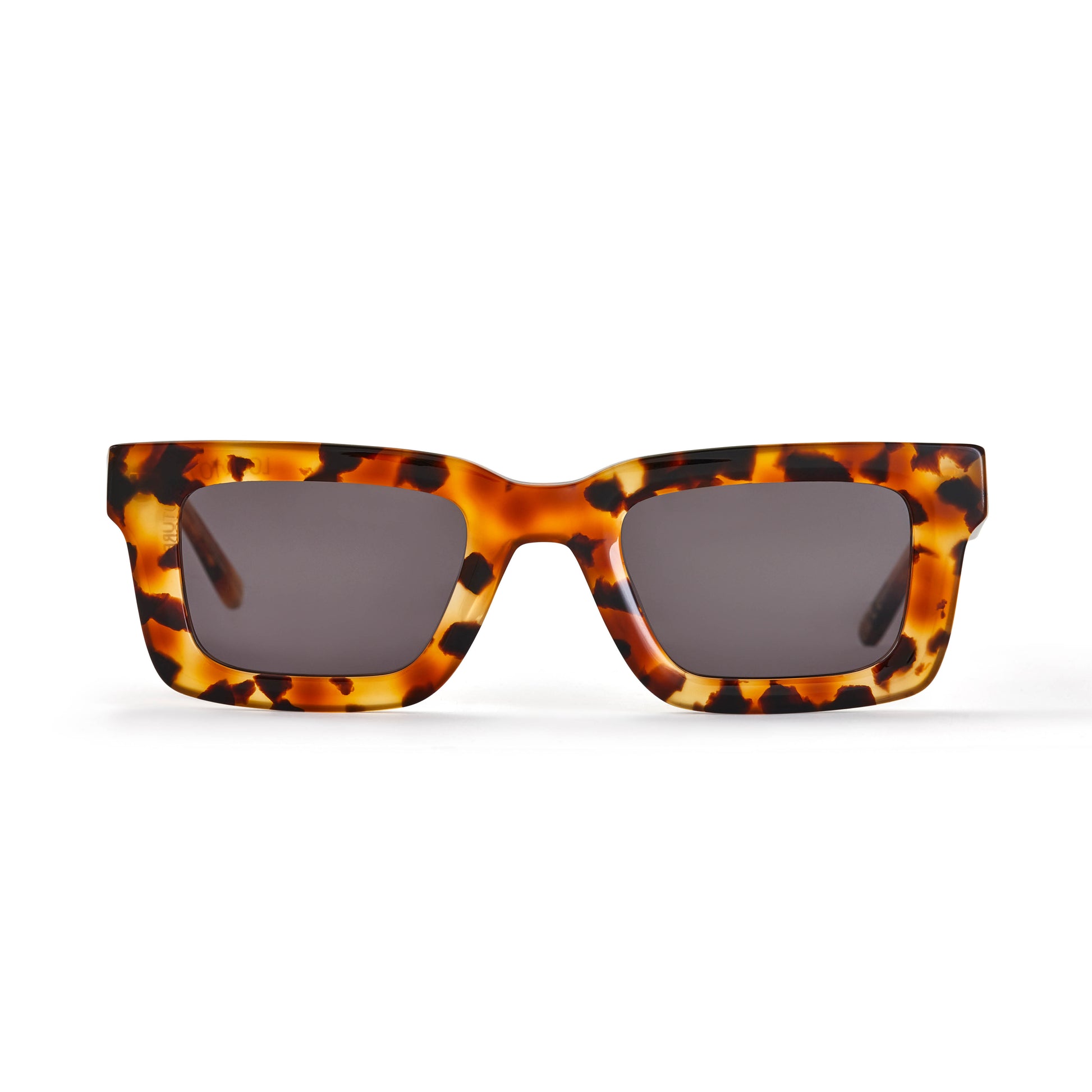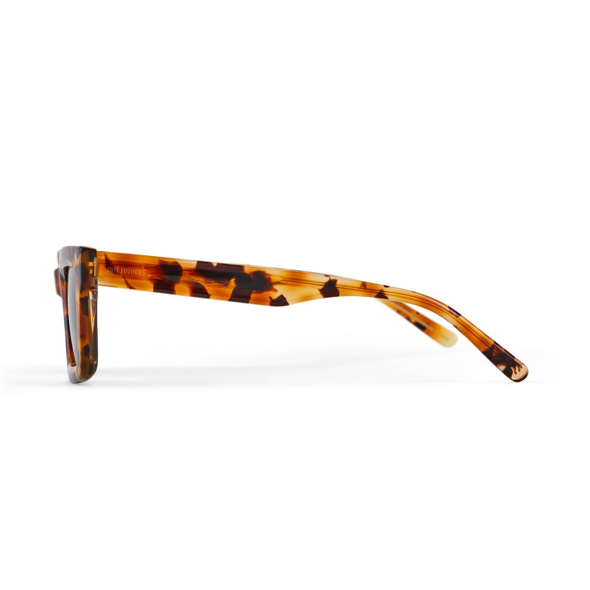 Bio-based, recyclable and biodegradable tortoiseshell eco acetate frame. Dark green tinted 100% UVA/UVB protected CR39 Category 3 lenses. Five barrel alloy hinges. Frame width (edge to edge):144.6mm // Temple Length: 145mm // Lens width: 47.5mm // Lens height: 32mm