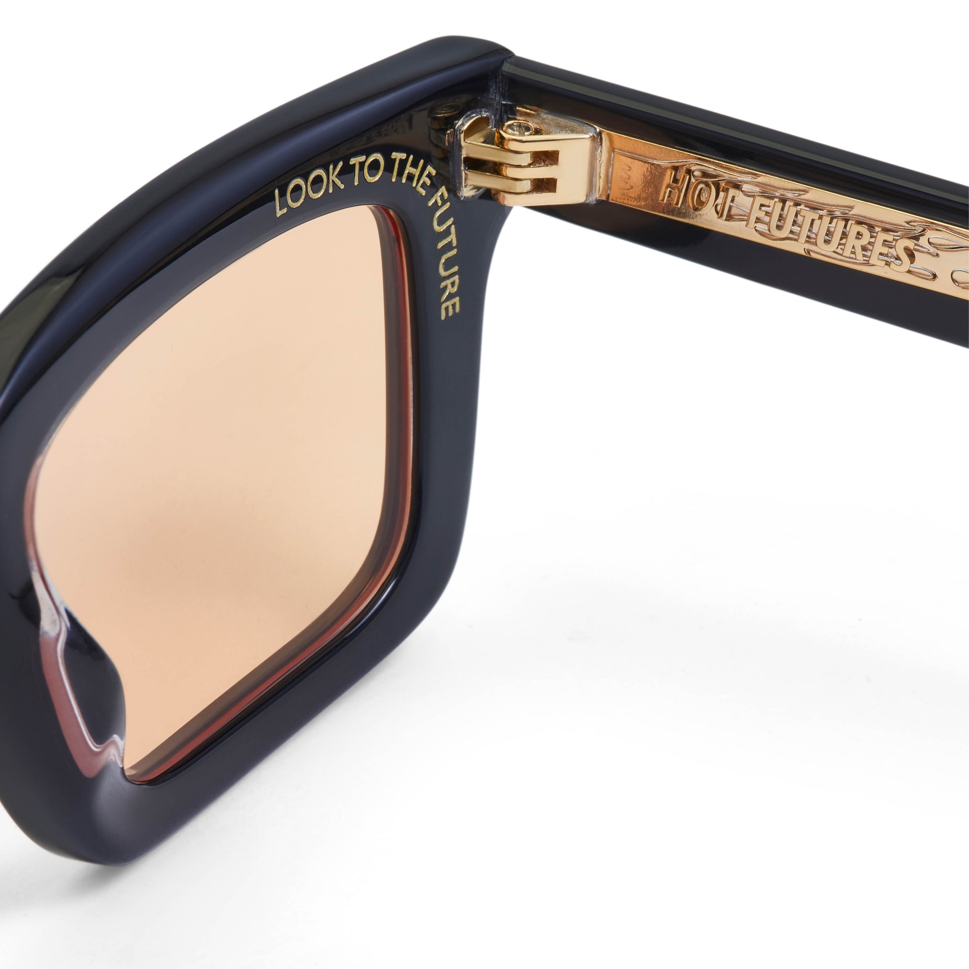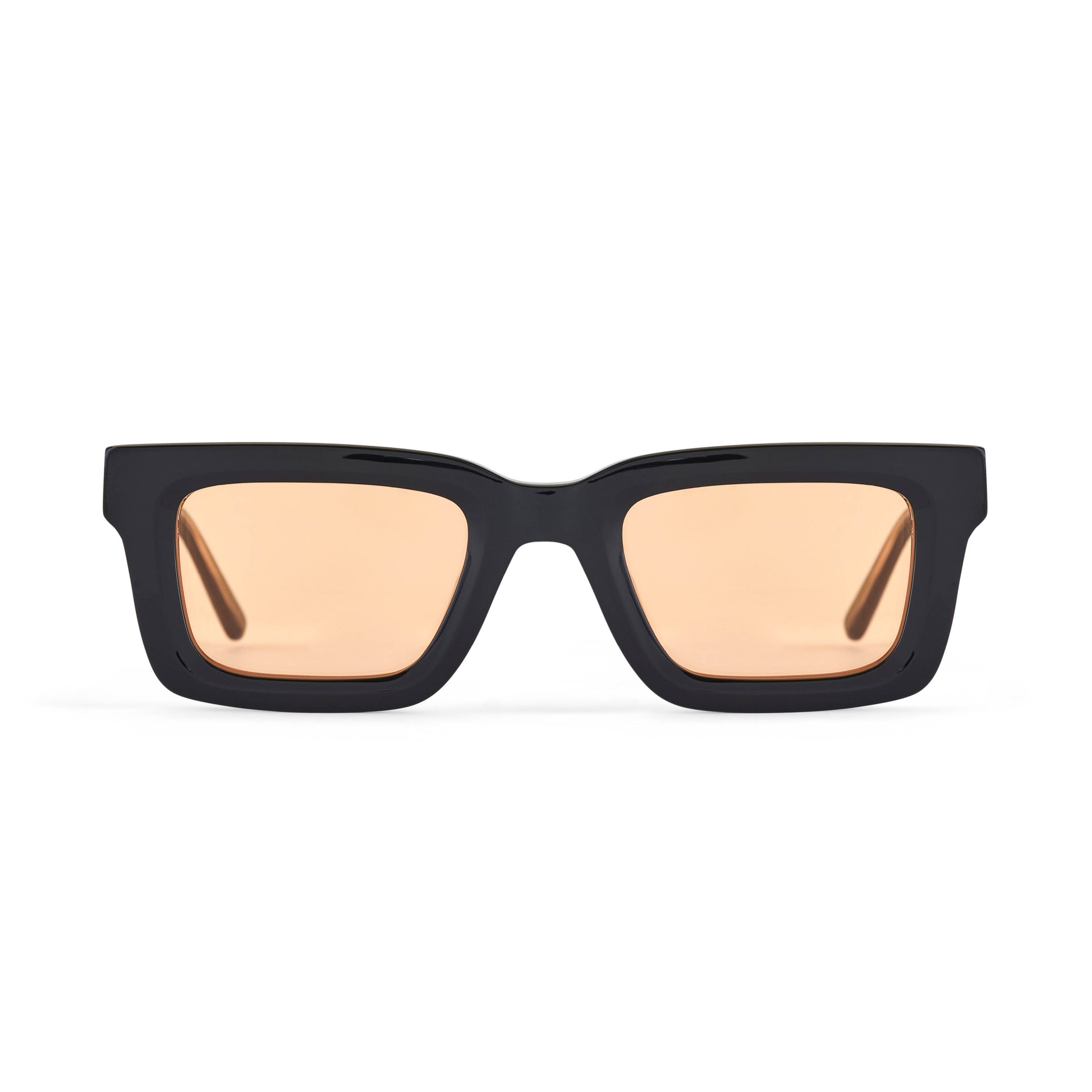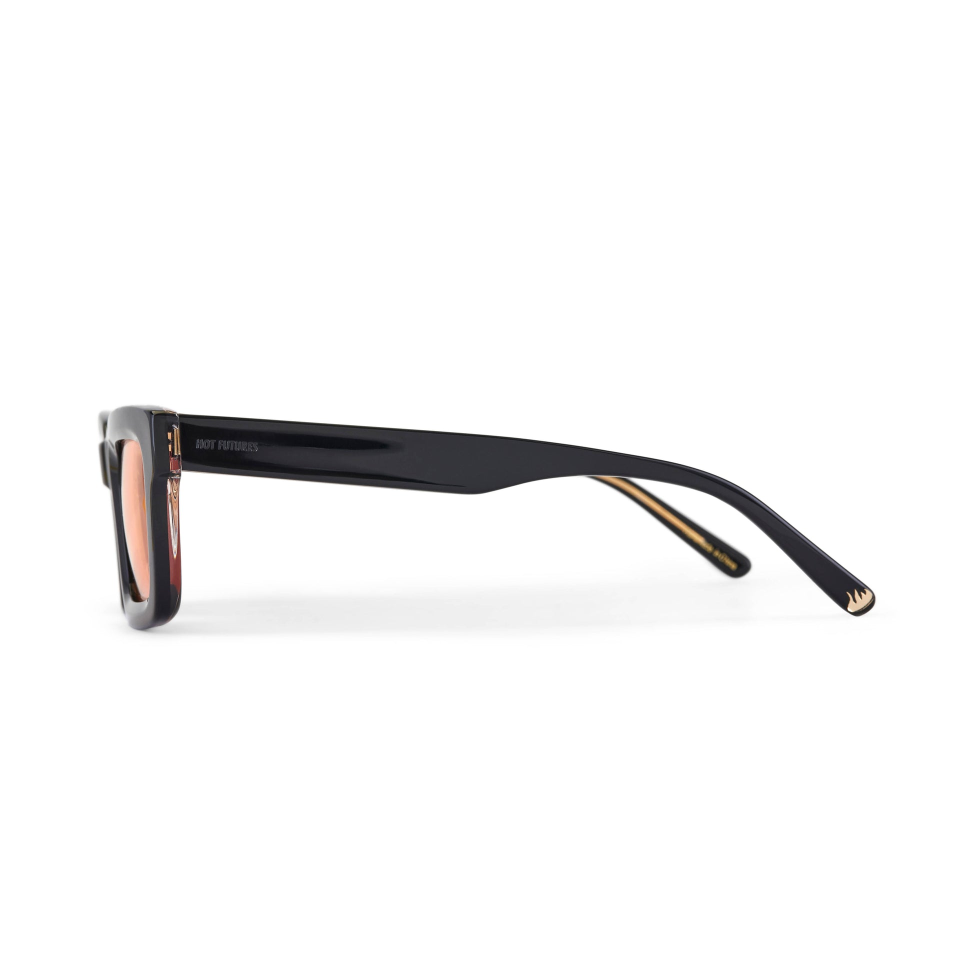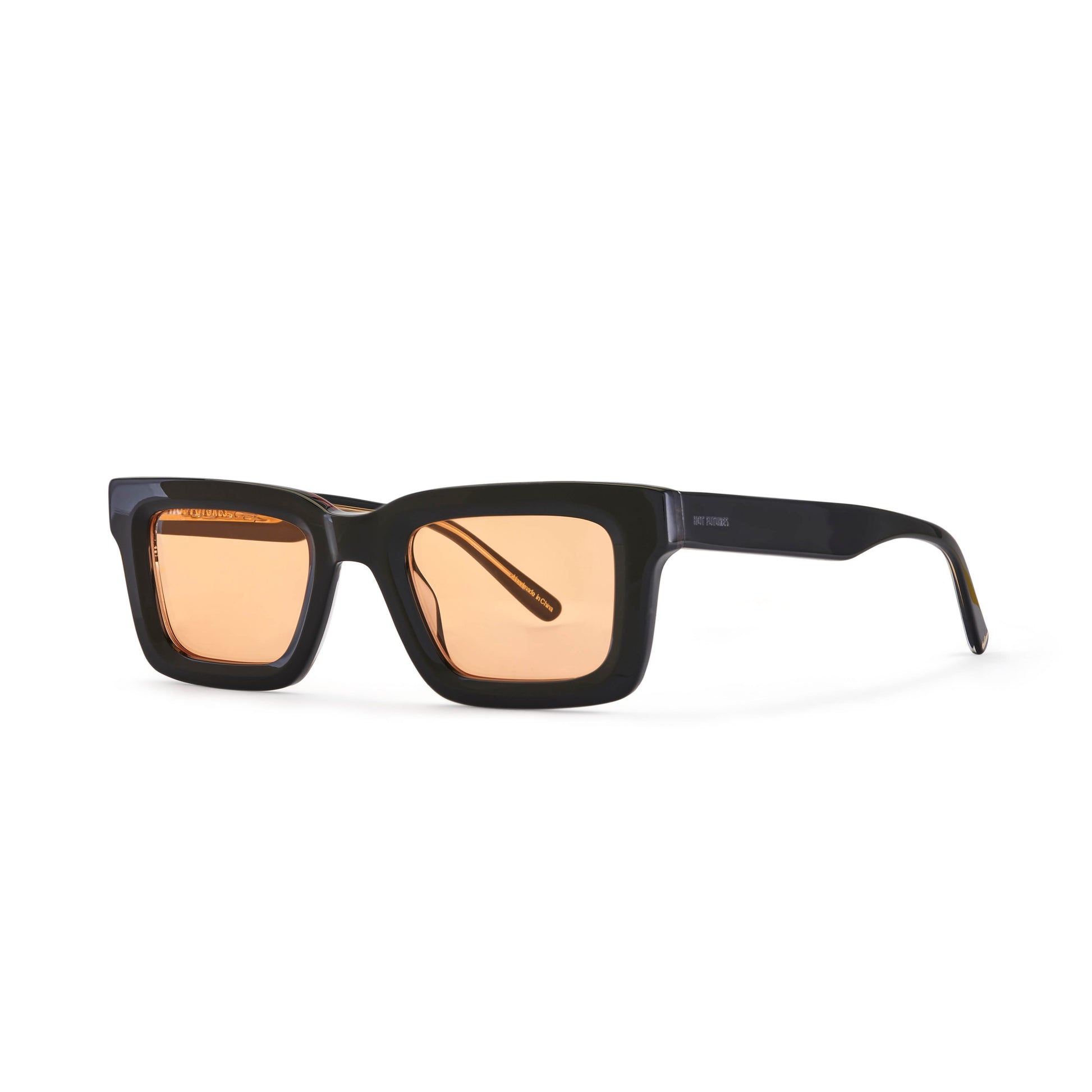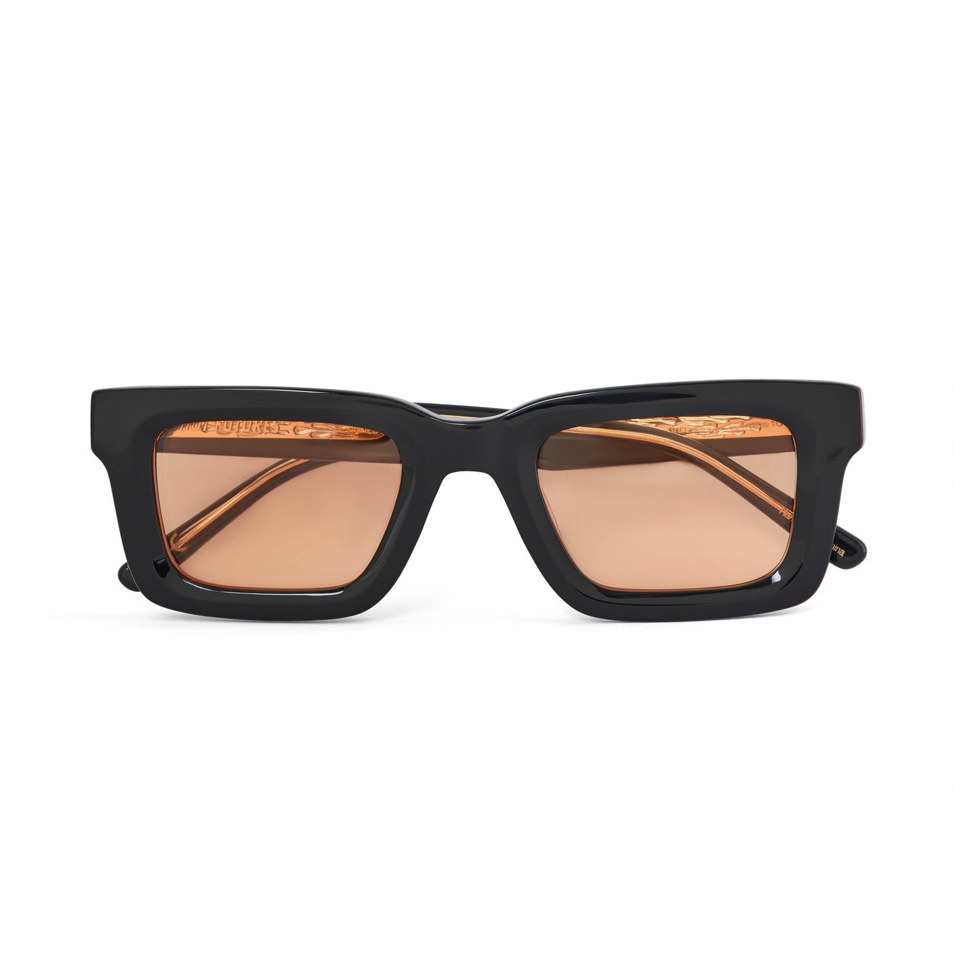 Recycled black acetate frame (Global Recycled Standard). Amber tinted 100% UVA/UVB protected CR39 Category 1 lenses. Five barrel alloy hinges. Frame width (edge to edge):144.6mm // Temple Length: 145mm // Lens width: 47.5mm // Lens height: 32mm