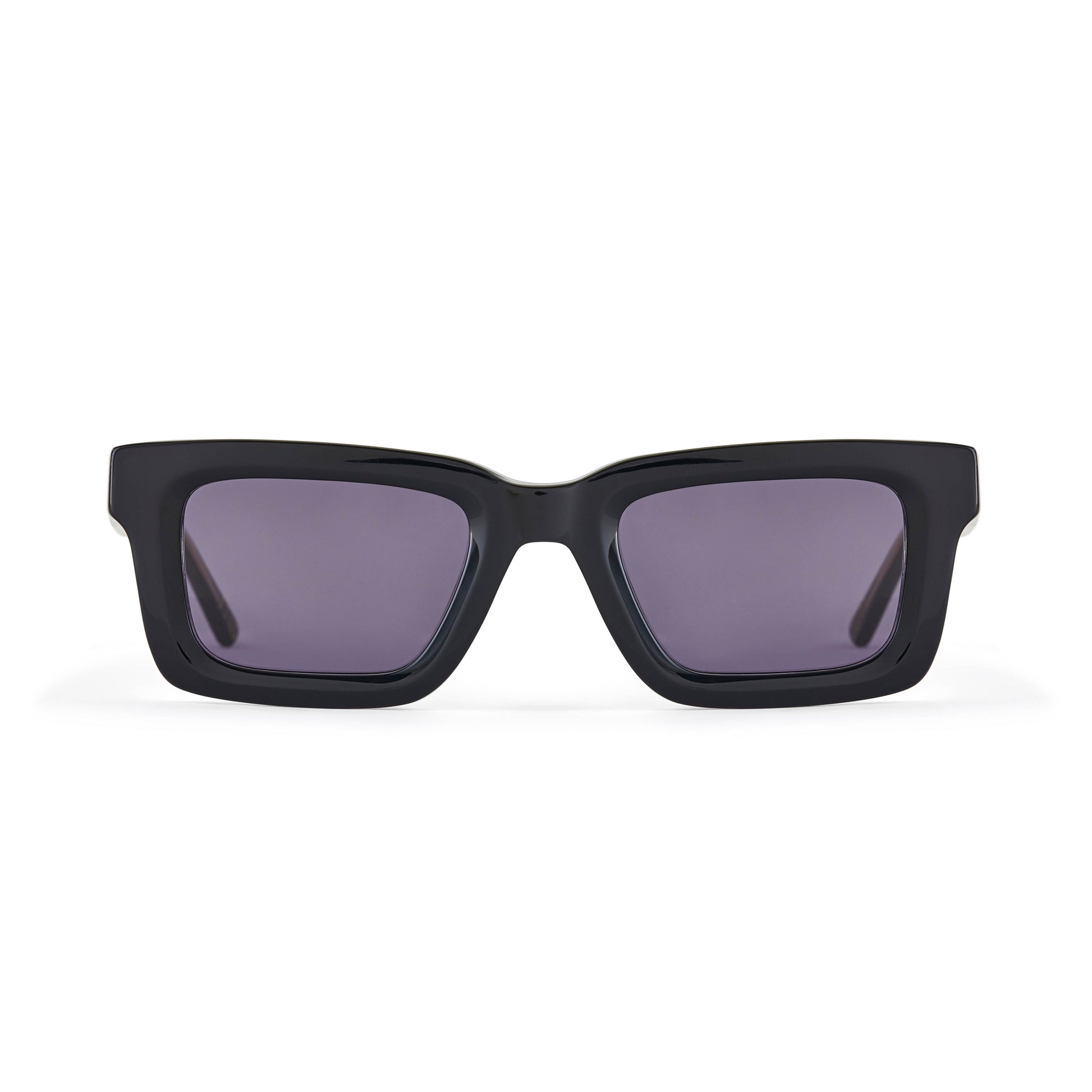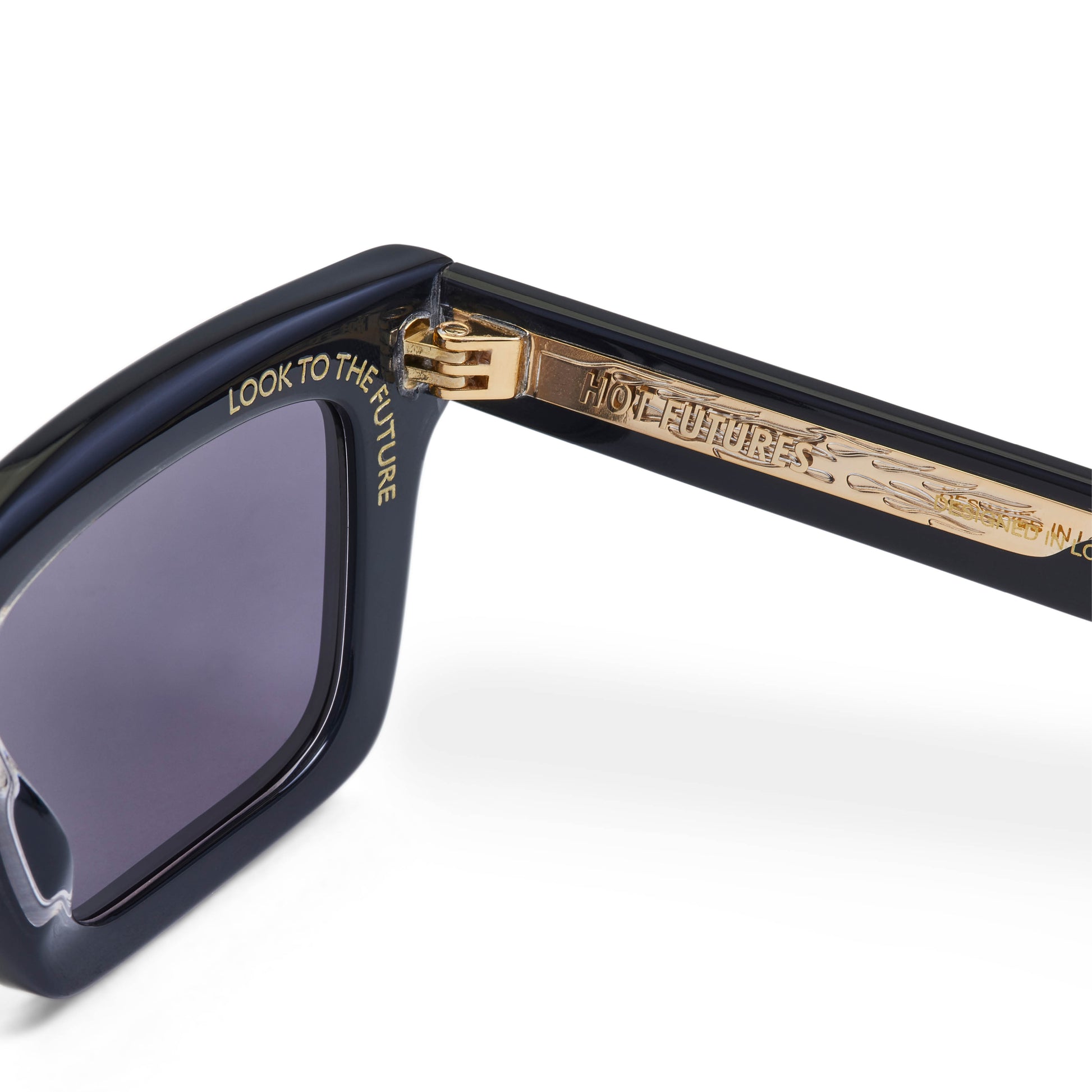 Recycled black acetate frame (Global Recycled Standard). Smoke tinted 100% UVA/UVB protected CR39 Category 3 lenses. Five barrel alloy hinges. Frame width (edge to edge):144.6mm // Temple Length: 145mm // Lens width: 47.5mm // Lens height: 32mm.