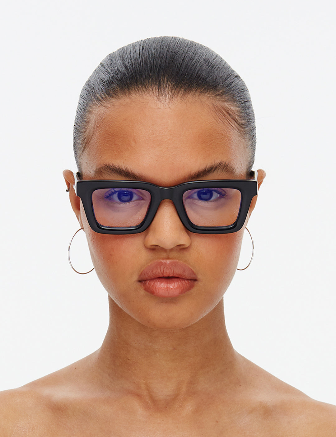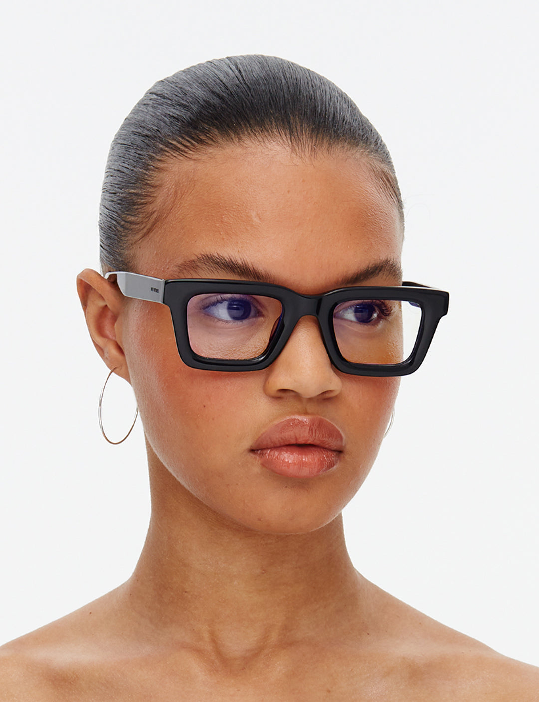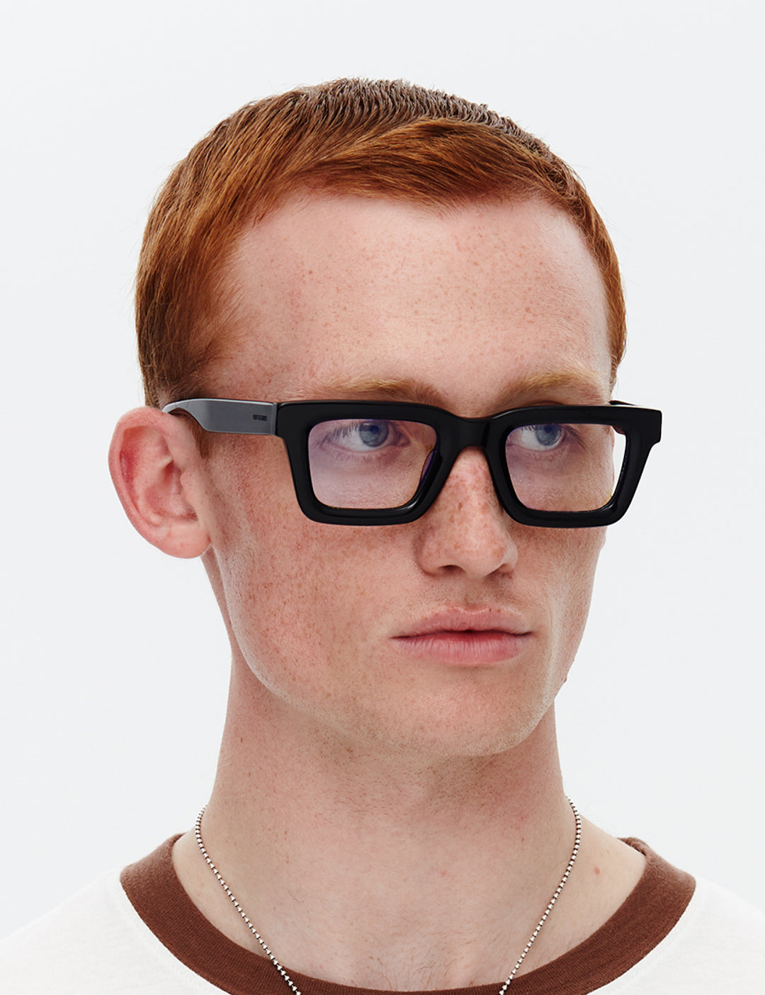 Recycled black acetate frame (Global Recycled Standard). Five barrel alloy hinges. Frame width (edge to edge):144.6mm // Temple Length: 145mm // Lens width: 47.5mm // Lens height: 32mm.