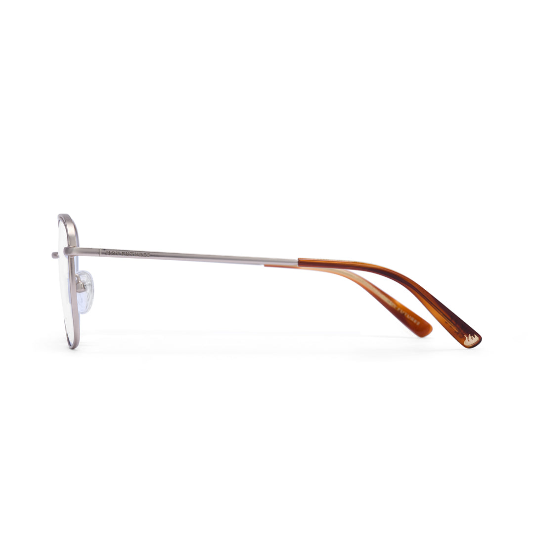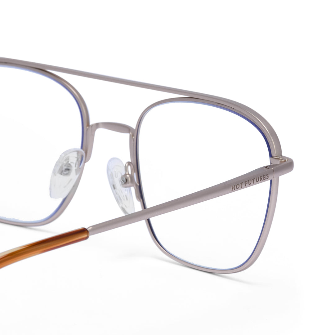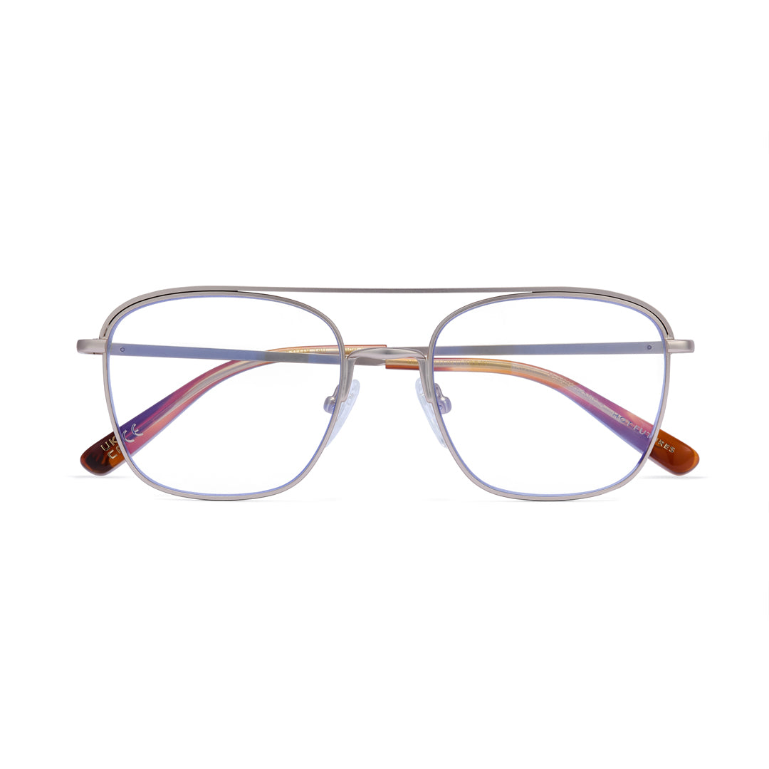 Blue light lenses with stainless steel frame. Integrated alloy hinges. Frame width (edge to edge): 134mm // Temple Length: 140mm // Lens width: 52mm // Lens height: 44mm.