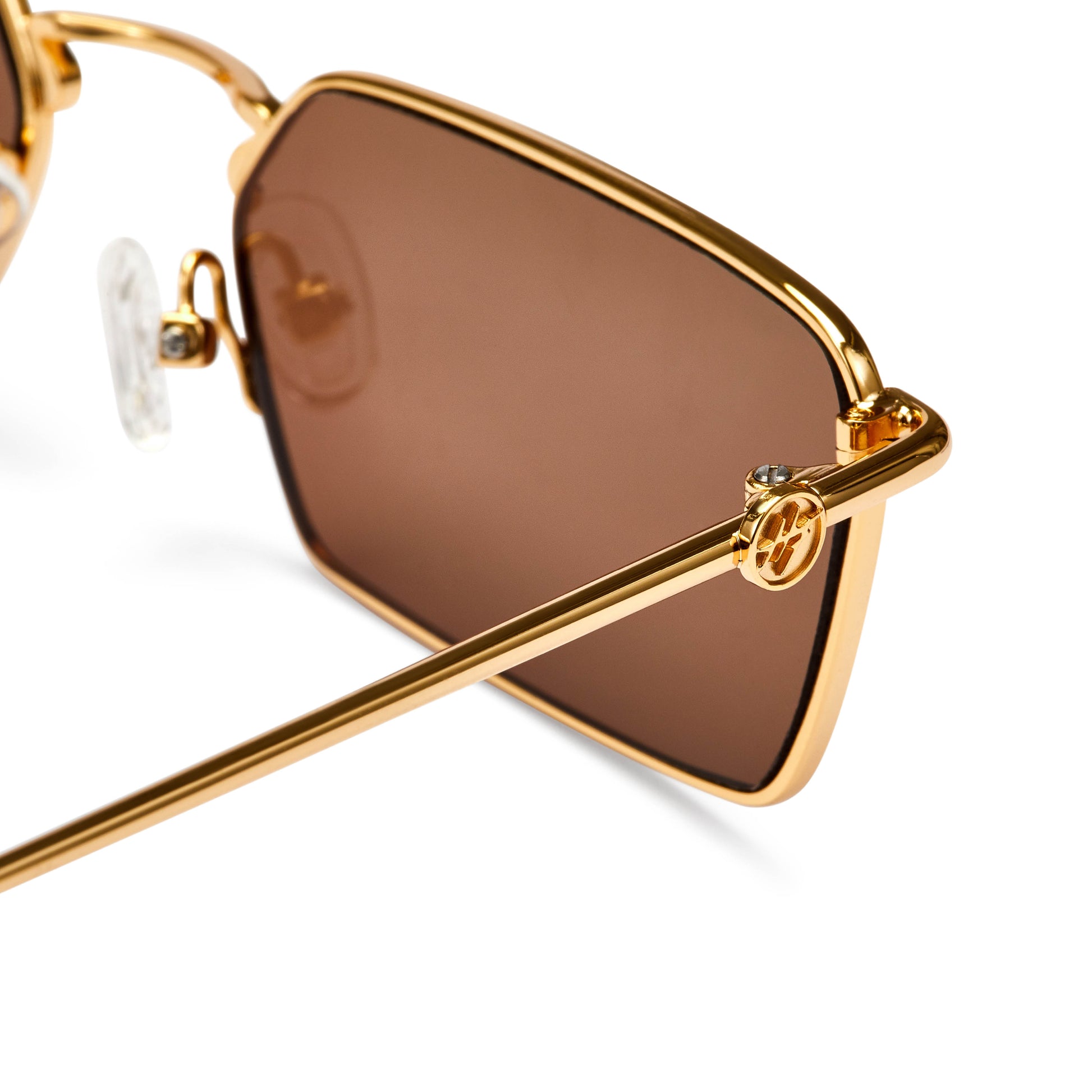 Handcrafted from high quality alloy metal. Tan 100% UVA/UVB protected CR39 Category 2 lenses. Three barrel alloy hinges. Frame width (edge to edge): 135mm // Temple Length: 143mm // Lens width: 51.5mm // Lens height: 31mm.