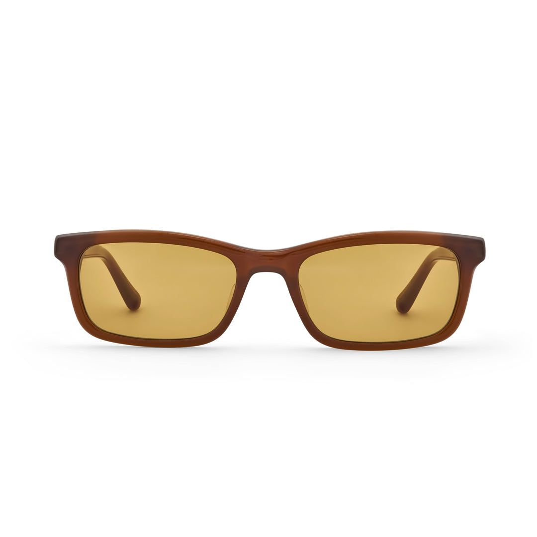 Brown acetate frame. O.G Gold 100% UVA/UVB protected CR39 Category 2 lenses. Integrated alloy hinges. Integrated alloy hinges. Frame width (edge to edge): 140mm // Temple Length: 150mm // Lens width: 53mm // Lens height: 31mm.