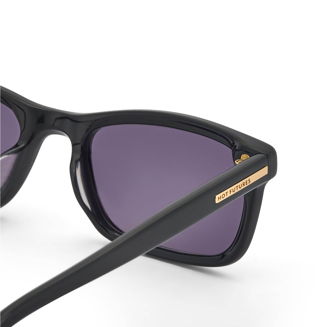 Recycled black acetate frame (Global Recycled Standard). Smoke 100% UVA/UVB protected CR39 Category 3 lenses. Integrated alloy hinges. Frame width (edge to edge): 140mm // Temple Length: 150mm // Lens width: 53mm // Lens height: 31mm.