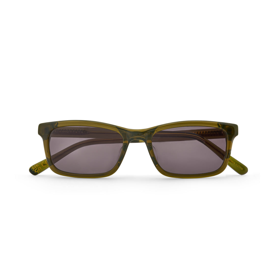 Olive green acetate frame. Dark green 100% UVA/UVB protected CR39 Category 3 lenses. Integrated alloy hinges. Frame width (edge to edge): 140mm // Temple Length: 150mm // Lens width: 53mm // Lens height: 31mm.