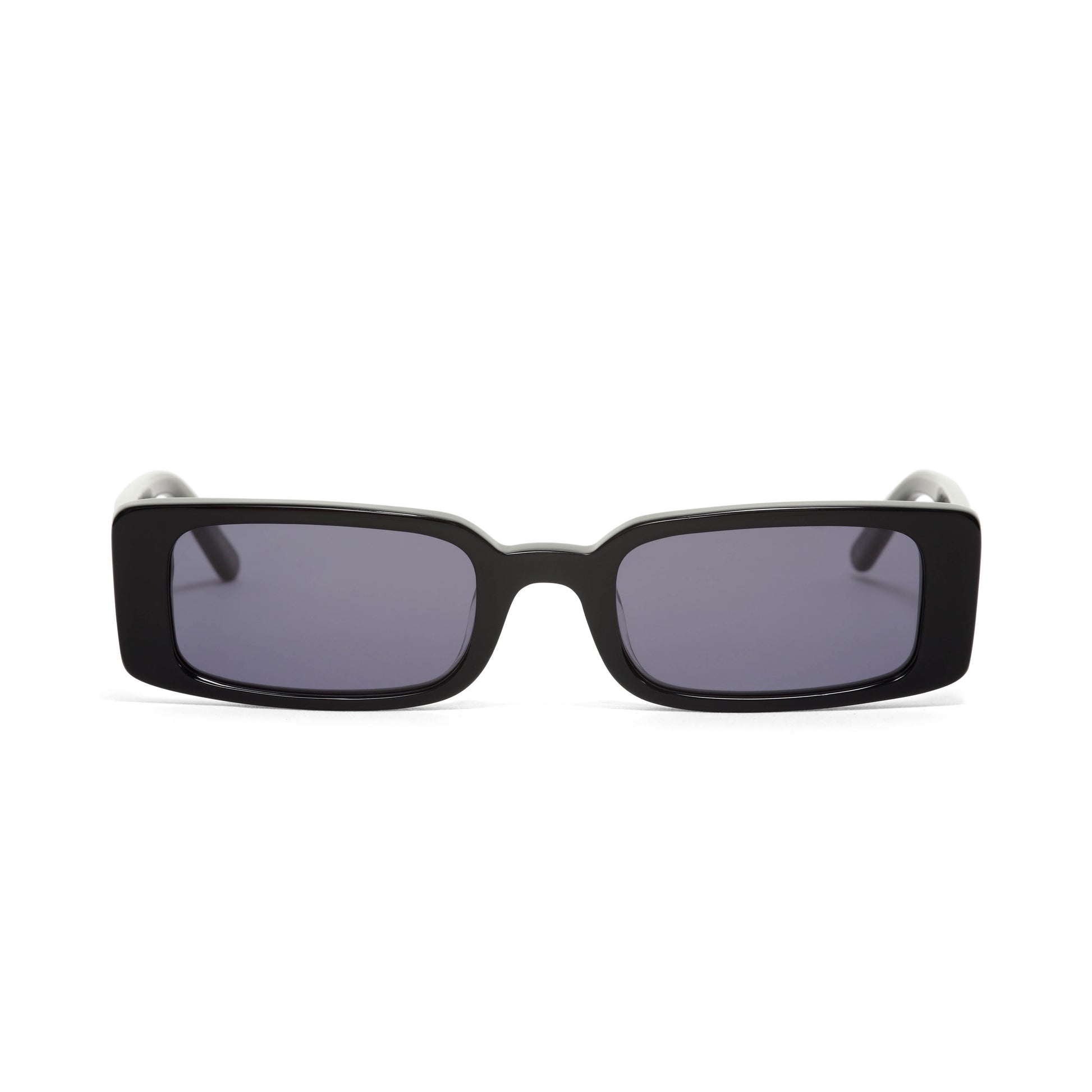 Recycled gloss black acetate frame (Global Recycled Standard). Smoke 100% UVA/UVB protected CR39 Category 3 lenses. Five barrel alloy hinges. Frame width (edge to edge): 142mm // Temple Length: 140mm // Lens width: 50mm // Lens height: 28mm.