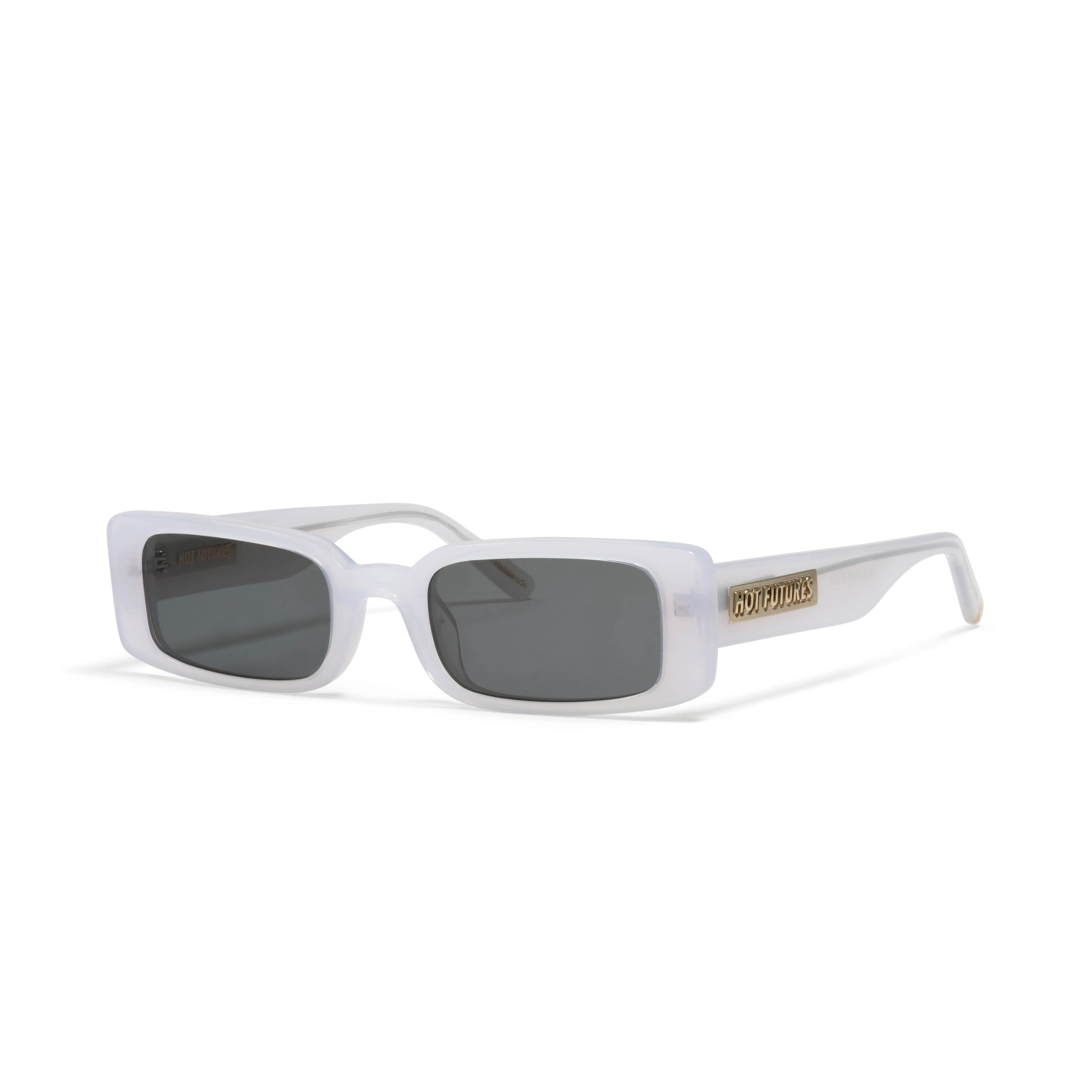Bio-based, recyclable and biodegradable milk white eco acetate frame. Smoke 100% UVA/UVB protected CR39 Category 3 lenses. Five barrel alloy hinges. Frame width (edge to edge): 142 // Temple Length: 140 // Lens width: 50 // Lens height: 28